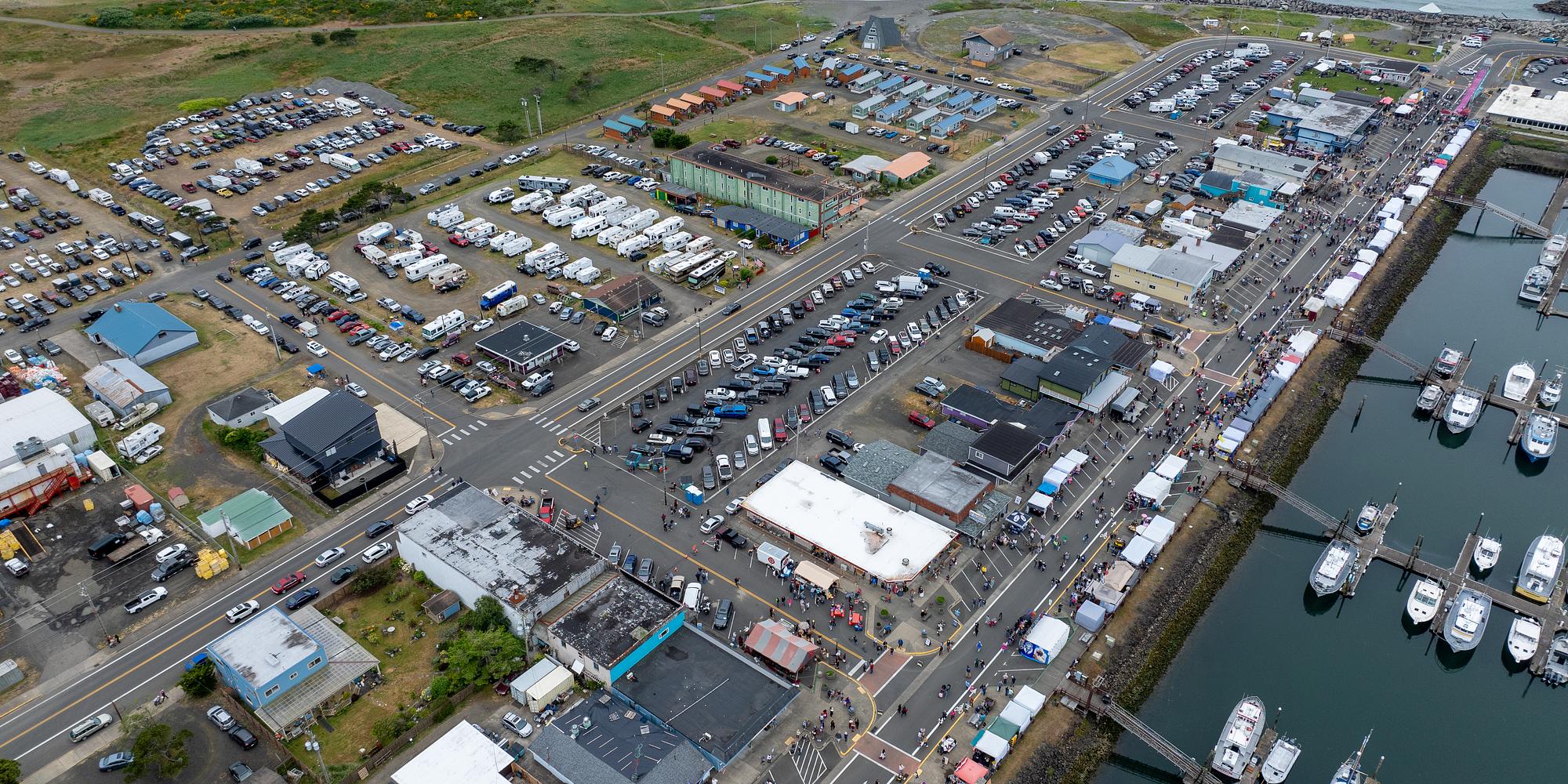 This wide-angle aerial shot captures the full scope of the Pirate Daze Festival 2024 in Westport, WA, highlighting the bustling marina and surrounding streets filled with festival activities. From above, you can see rows of vendor tents lining the waterfront, vibrant crowds celebrating the event, and the picturesque view of boats docked at the marina. The image also features the nearby RV parks and local businesses, showcasing the lively atmosphere that takes over the town during this popular annual event.
